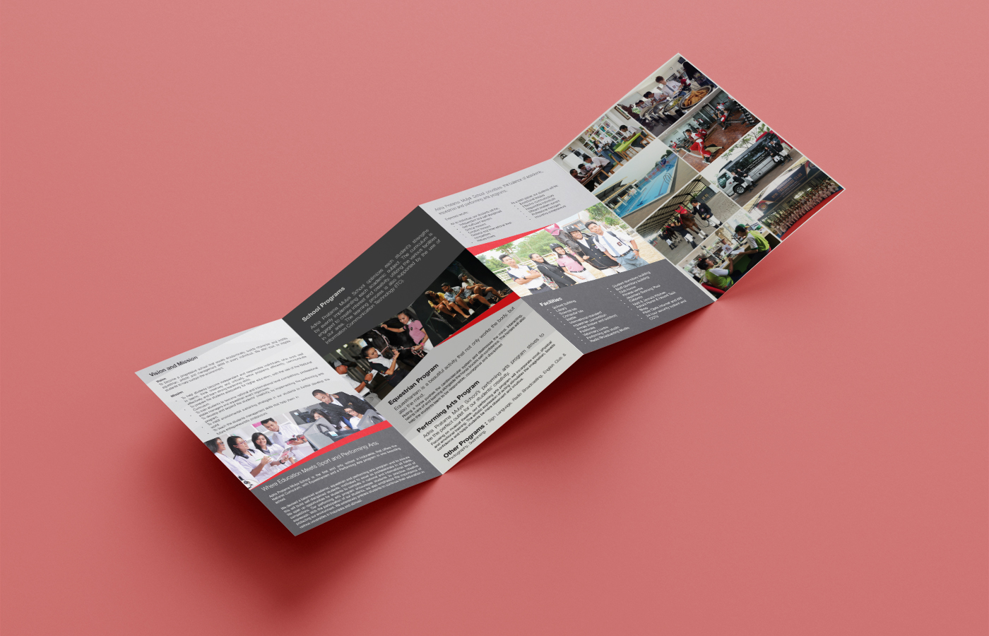 Flyer SMA Adria Pratama Mulya di desain dengan sistem 4 lipatan dua sisi, yang memuat informasi pembuka pada halaman pertama dan informasi mengenai Visi Misi, Program Pendidikan dan tampilan fasilitas yang dimiliki oleh SMA APM. Media cetak menggunakan kertas Art Paper 150gr dan dilaminasi dof serta menggunakan proses lipat mesin.