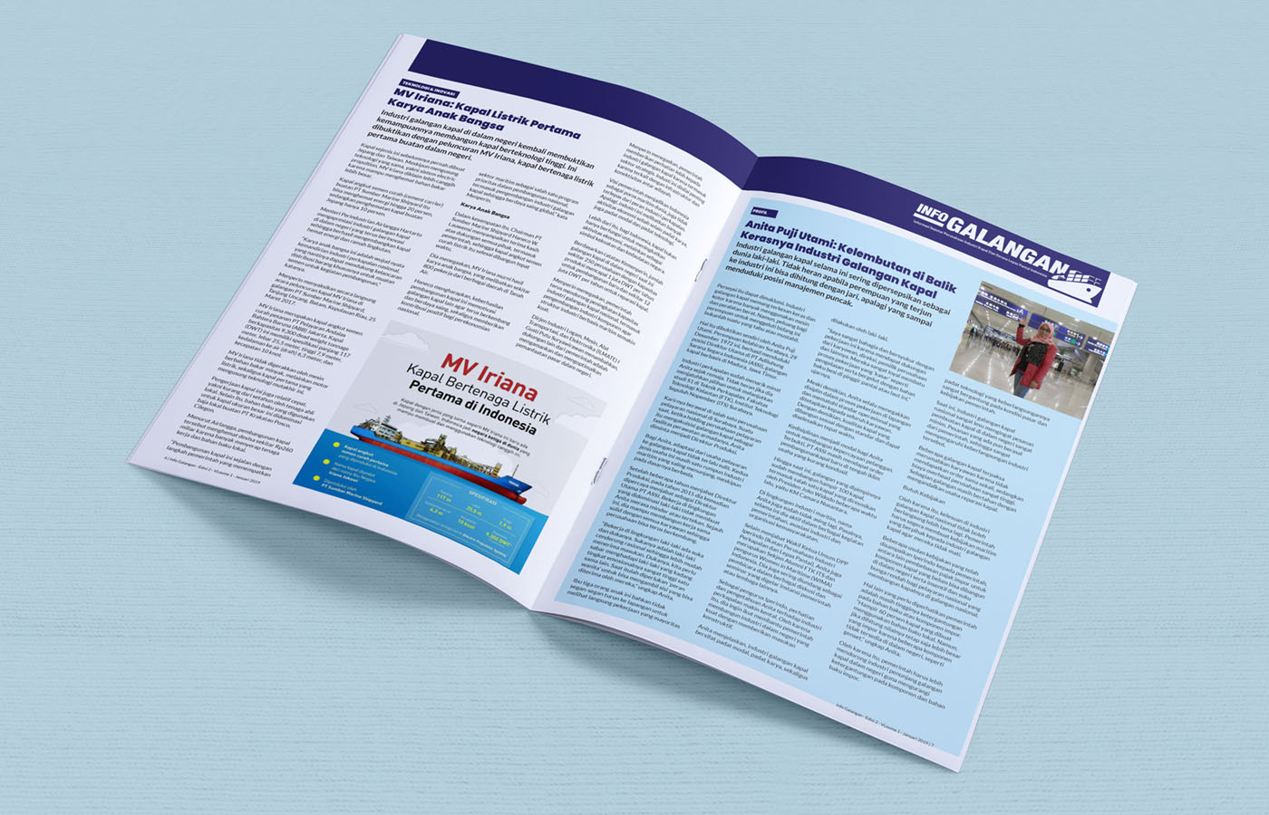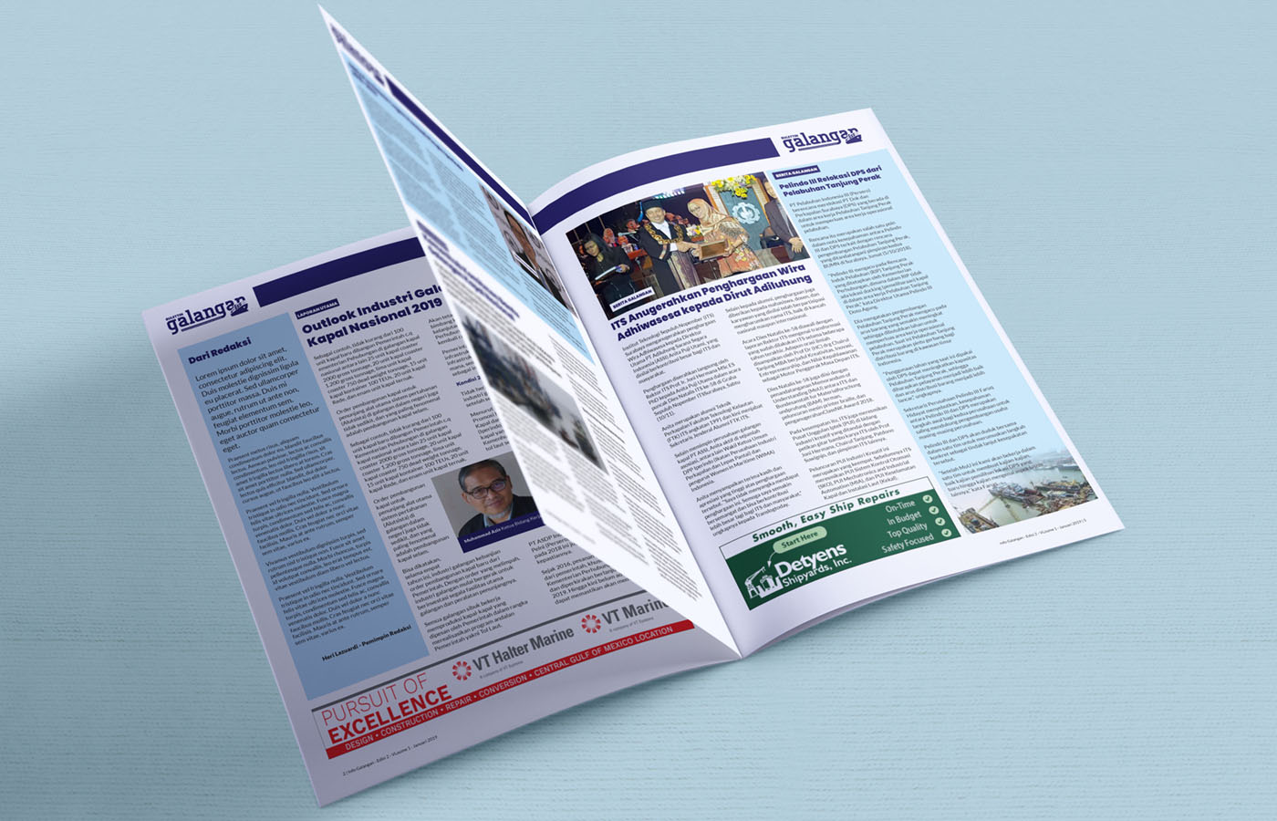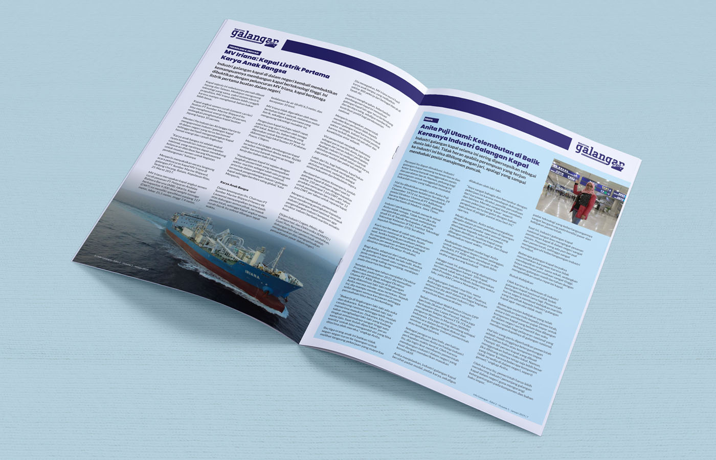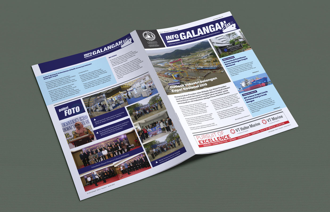 Desain bulletin bulanan “Galangan” untuk IPERINDO ini mengadopsi tampilan profesional dan modern, menggunakan tata letak yang terstruktur dengan dominasi warna biru dan putih. Cover menampilkan foto industri galangan kapal yang menarik dan headline laporan utama yang tegas, bertujuan untuk menyajikan berita dan profil industri maritim secara informatif, kredibel, dan visual yang powerful.