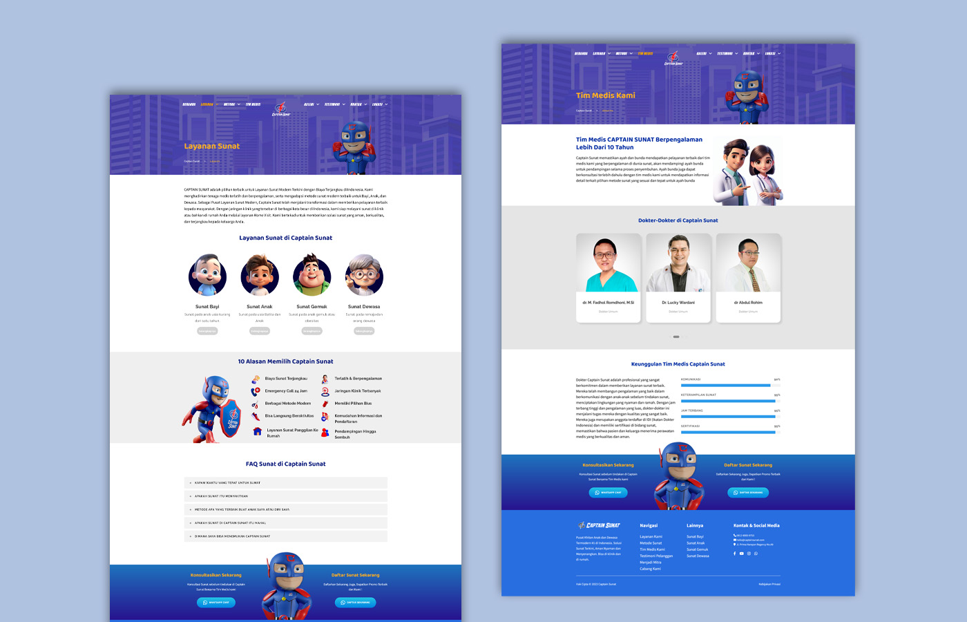 Website Captain Sunat dirancang dengan tampilan cerah dan karakter maskot heroik untuk menciptakan kesan ramah anak dan profesional. Mengedepankan layanan sunat modern yang terjangkau dan terpercaya, situs ini menampilkan informasi lengkap tentang keunggulan layanan, jaringan klinik, hingga artikel edukatif seputar kesehatan. Desainnya yang dinamis dengan kombinasi warna biru dan merah memperkuat identitas merek serta menghadirkan pengalaman pengguna yang informatif, interaktif, dan menyenangkan bagi keluarga.